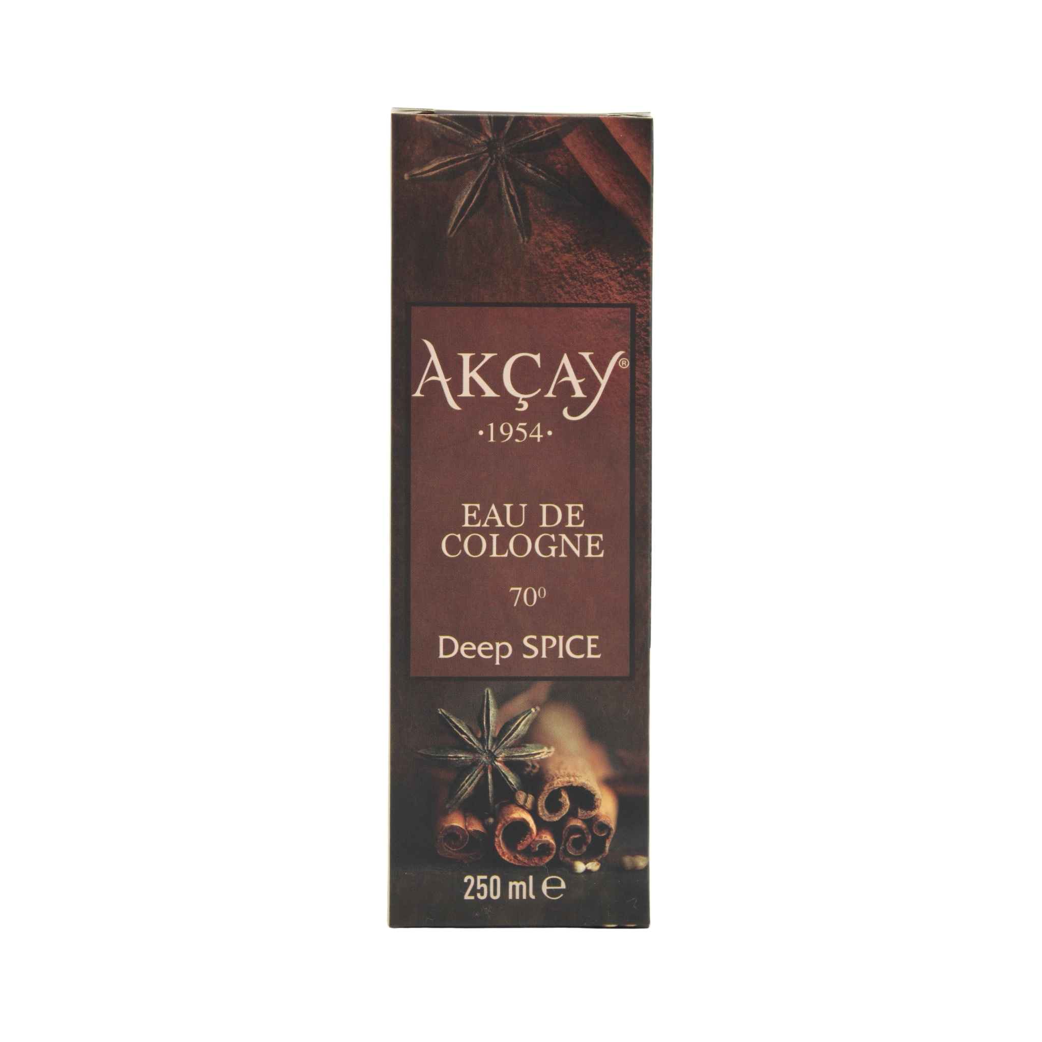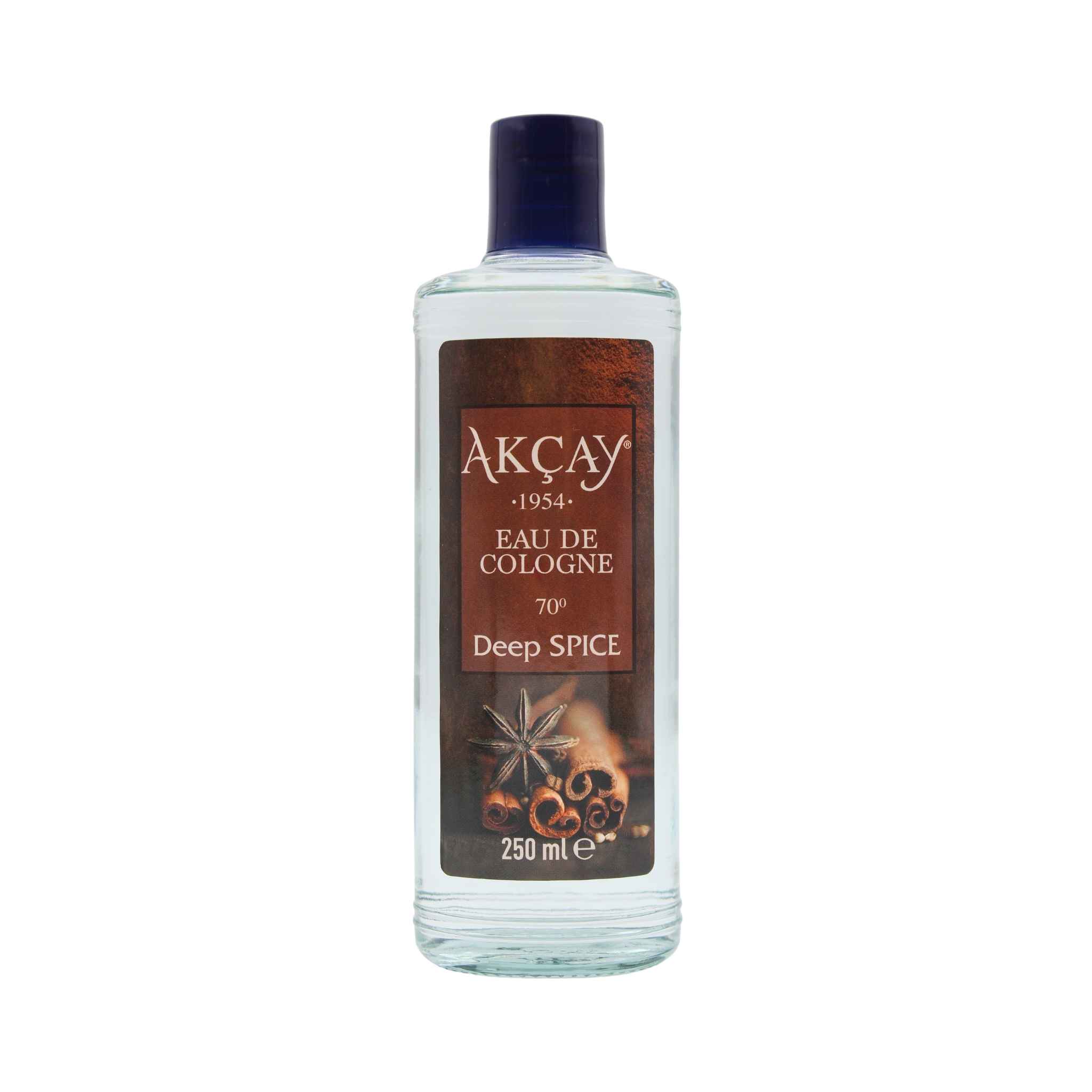 Akçay Deep Spice Kolonyası 70° – 250 ml Cam Şişe, doğanın baharatlı ve kalıcı kokusunu evinize getiriyor. Bu eşsiz kolonya, özgün formülü ile uzun süre kalıcı olup, baharatın büyüleyici aromasıyla duyularınızı canlandırır. Kolonyacım güvencesiyle sunulan bu ürün, 70° alkol oranıyla etkili hijyen sağlar ve günlük kullanıma uygundur. Hem ellerinizi dezenfekte edin hem de baharatlı bir koku ile gününüzü canlandırın.